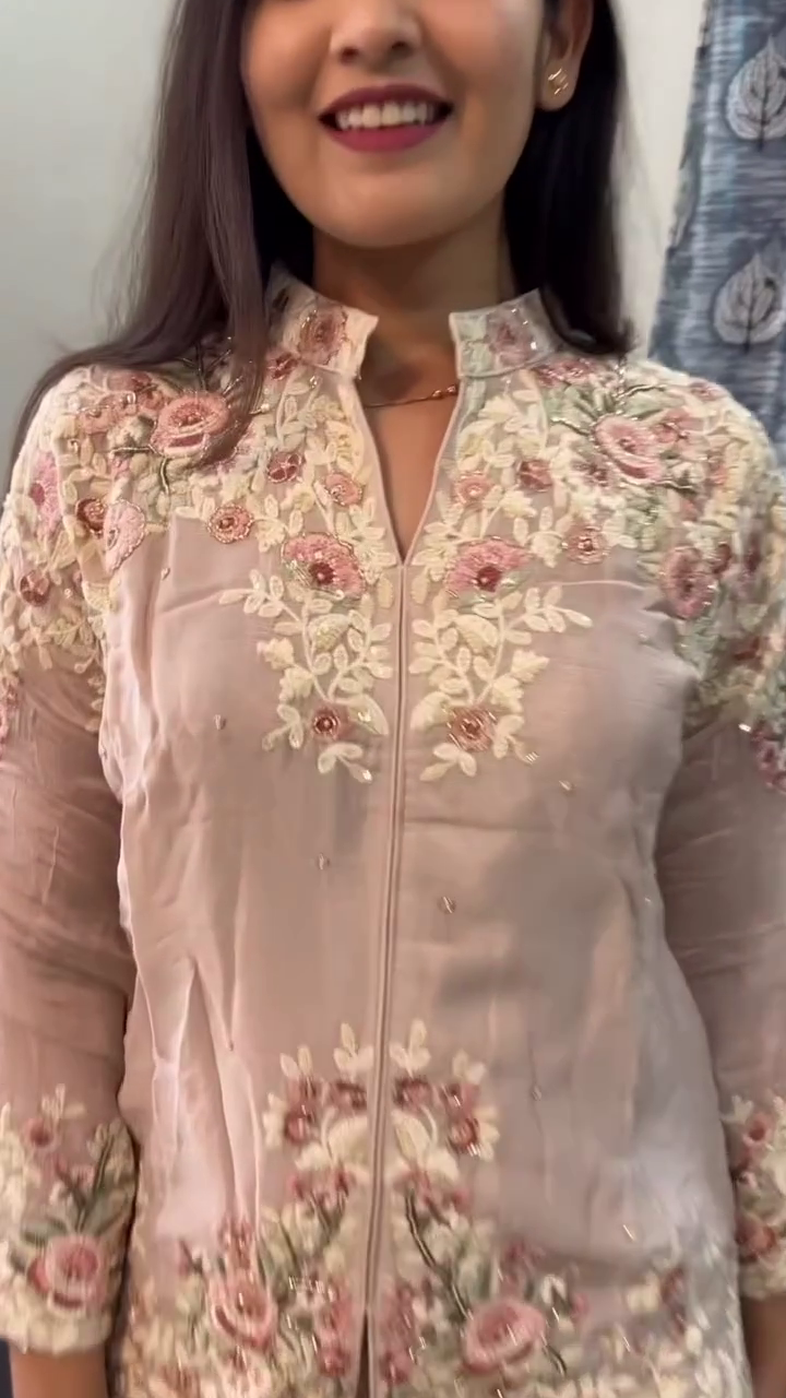 Crafted in a beautiful blush pink tone π·, this co-ord set radiates charm and femininity. The top features intricate floral embroidery across the neckline, sleeves, and hem, adding a luxurious handcrafted touch πΌ. The fine threadwork enhances the overall elegance, creating a rich yet subtle look that feels premium and refined.