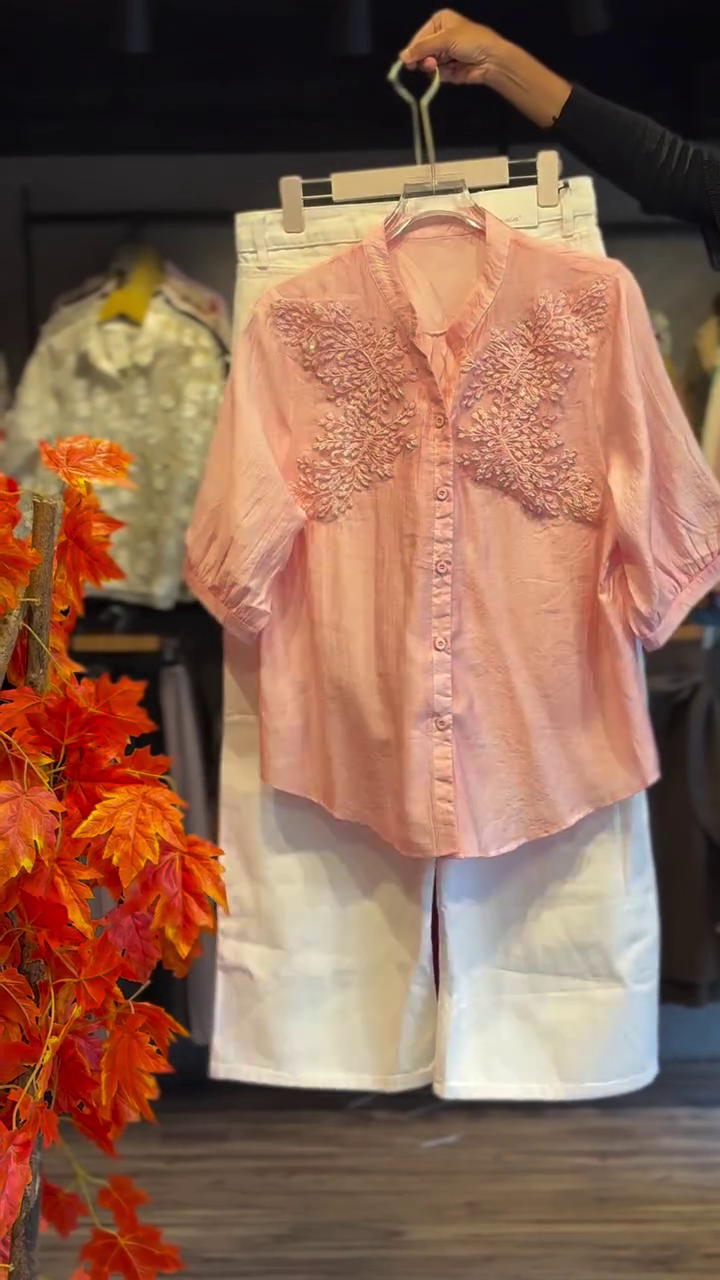 The highlight of this set is the blush pink embroidered shirt 🌸. Crafted in a lightweight, breathable fabric, it features intricate floral threadwork across the front bodice, creating a luxurious textured effect. The subtle sheen of the fabric enhances its rich finish, while the soft mandarin-style collar and front button closure give it a refined, polished look. The half sleeves add a modern, relaxed touch — perfect for day-to-evening styling.