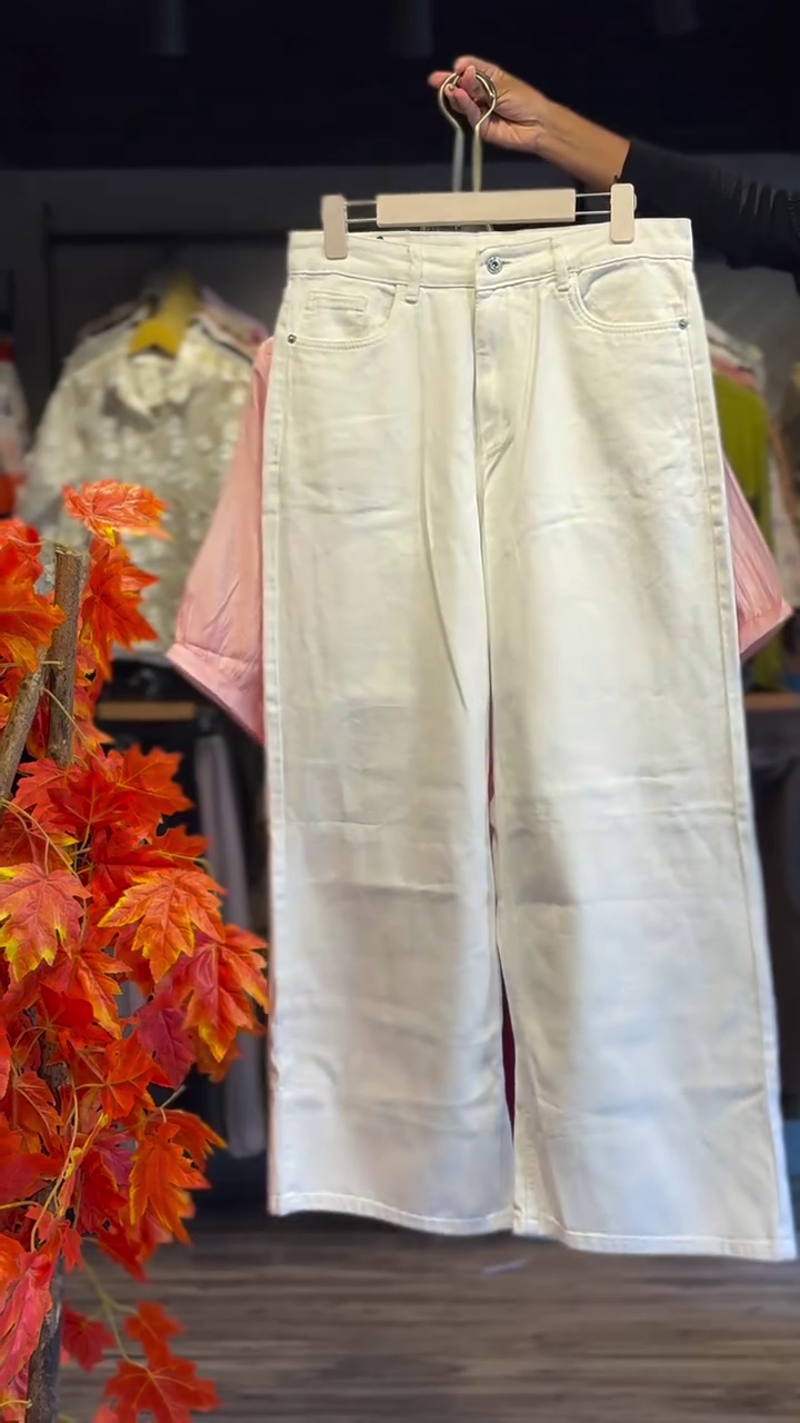 Paired with ivory wide-leg pants 🤍, this outfit creates a stunning contrast that feels fresh and elegant. The pants feature a high-rise waist with a structured front and relaxed wide-leg silhouette, offering both comfort and a flattering drape. The clean finish and minimalist design balance the ornate embroidery of the shirt, making the entire look cohesive and sophisticated.