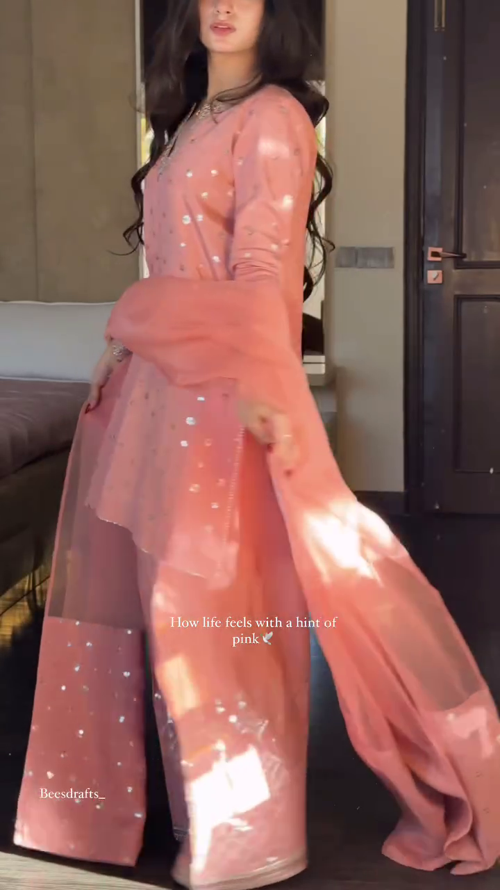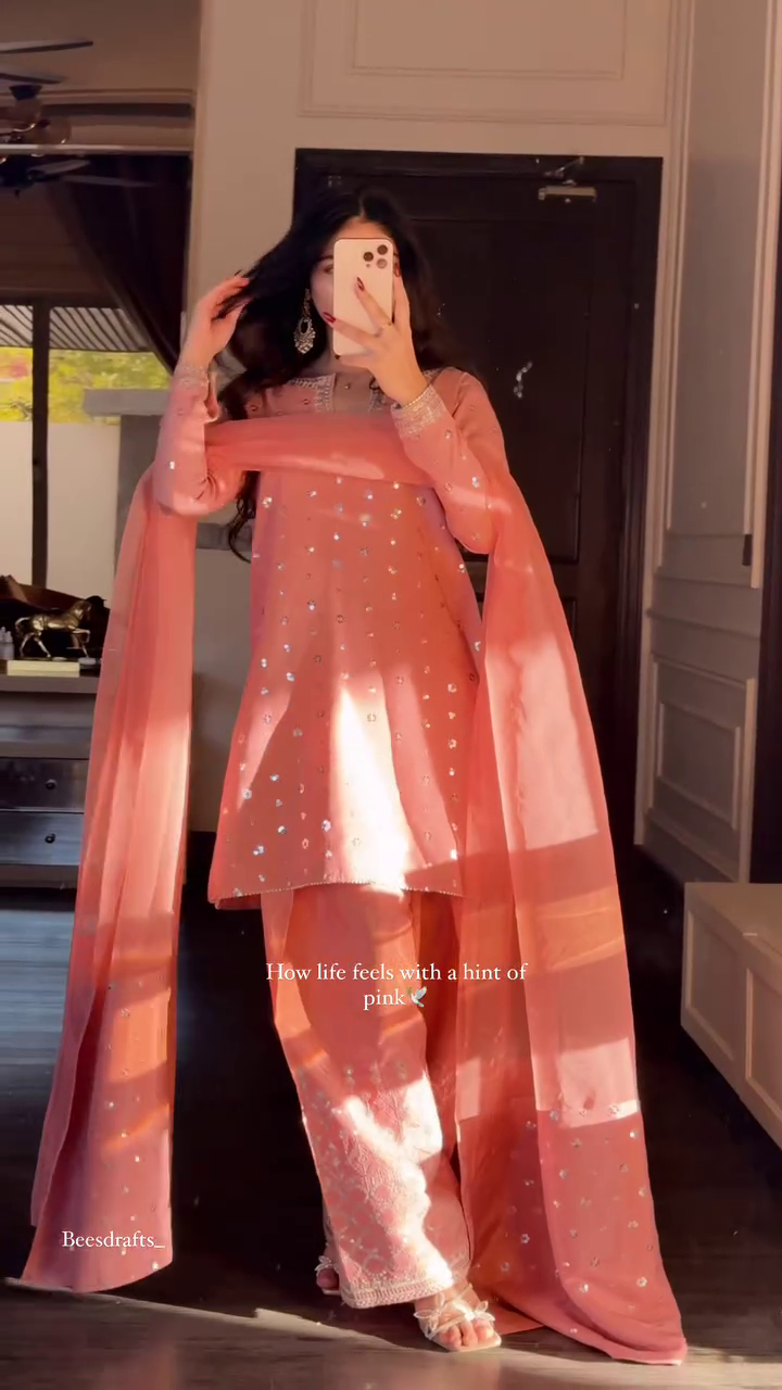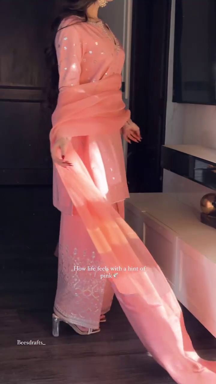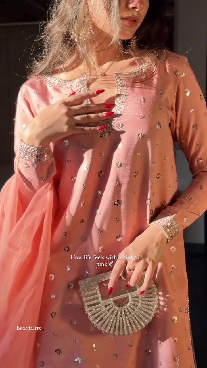 The suit features a soft blush pink hue, a color that exudes femininity and calmness while adding a glow to your presence. The kurta is adorned with delicate mirror and gota work all over, adding just the right amount of festive dazzle π. The neckline is intricately detailed with subtle golden embroidery, giving it a regal touch that complements any occasion β from family gatherings to festive celebrations. π