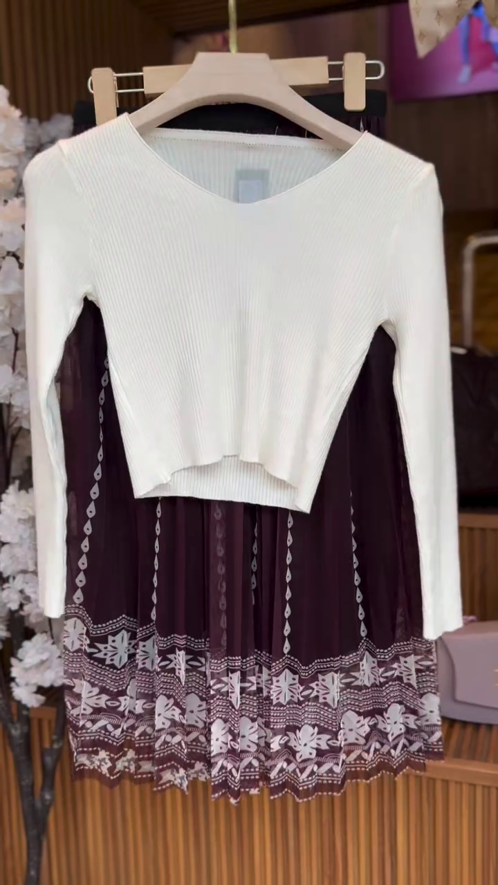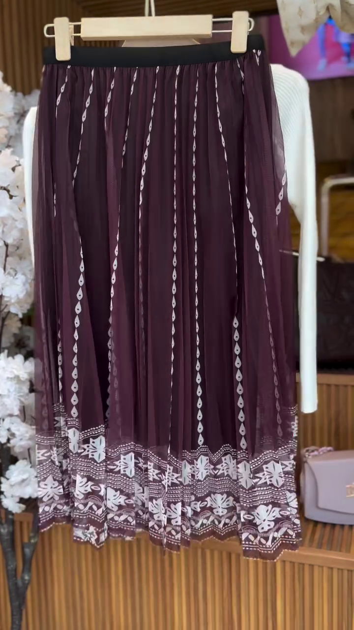 Paired with a flowy printed midi skirt 🍂, this outfit creates a beautifully balanced silhouette. The skirt features delicate vertical patterns and a detailed border print that adds depth and elegance. Its lightweight, airy fabric moves gracefully with every step, while the elastic waistband ensures a secure and comfortable fit.