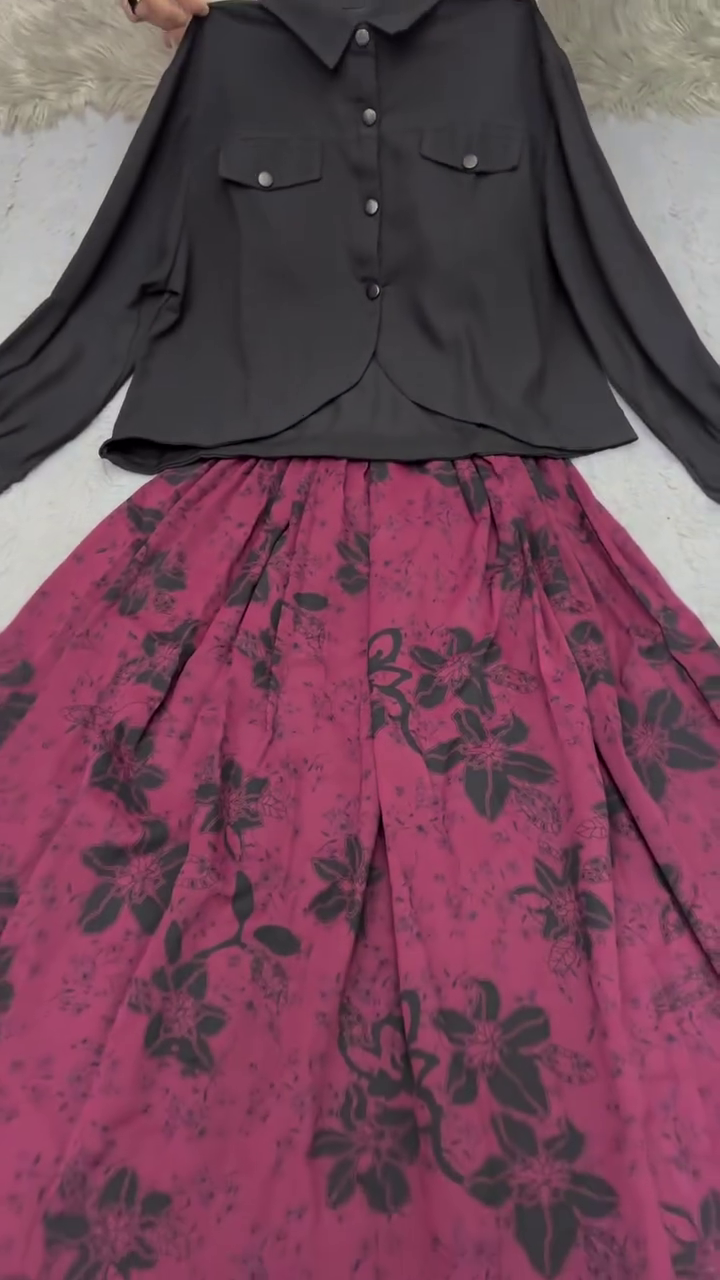 Overall, this black button-down top and maroon floral skirt two-piece outfit is a refined, stylish, and versatile choice. It offers a perfect blend of neutral sophistication and feminine charm, making it a must-have for any fashion-forward wardrobe.
