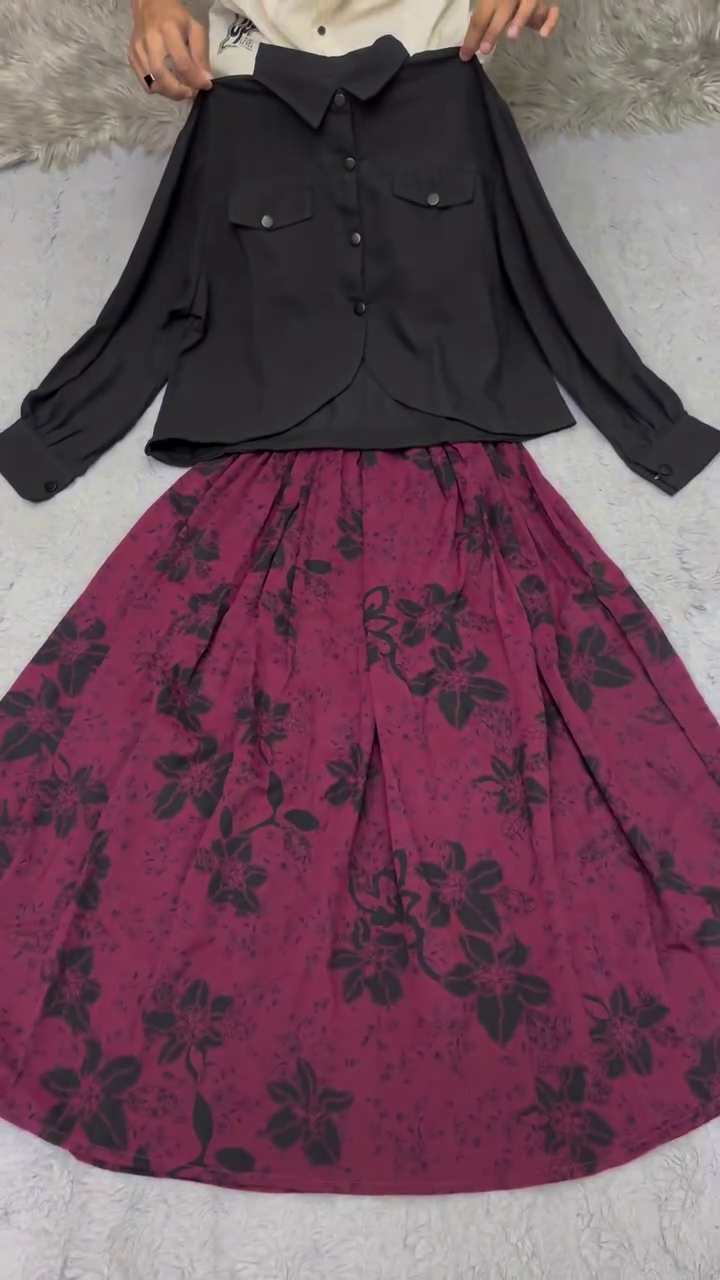 A two-piece women’s outfit featuring a black button-down long-sleeved top paired with a maroon skirt adorned with a black floral pattern is the perfect blend of elegance, femininity, and modern style. This combination effortlessly balances sophistication and charm, making it suitable for office wear, brunch dates, evening outings, or semi-formal events.