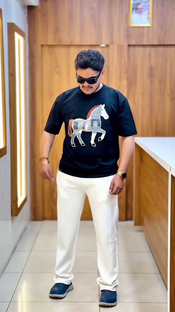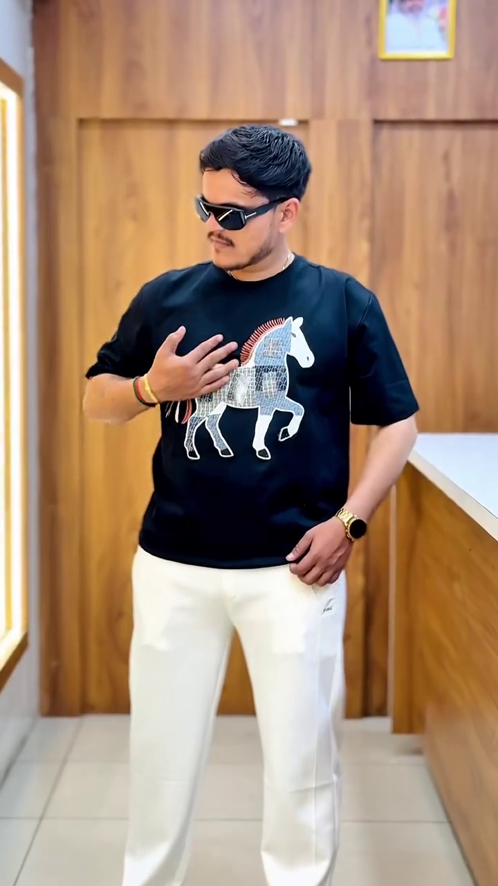Crafted in a classic black base, the shirt features a beautifully detailed horse graphic across the chest. The artistic design combines textured patterns with subtle contrast accents, creating a powerful yet refined visual statement. The bold yet balanced artwork makes this tee a true head-turner. π¨π